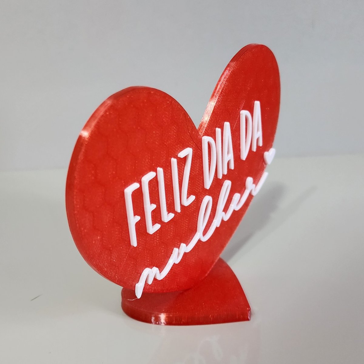 Coração decorativo na cor vermelho translúcido com a mensagem “Feliz Dia da Mulher”, perfeito para enfeitar estantes, mesas ou prateleiras. Um item delicado e cheio de significado, ideal para presentear e homenagear em datas especiais, trazendo charme e um toque afetivo ao ambiente.
