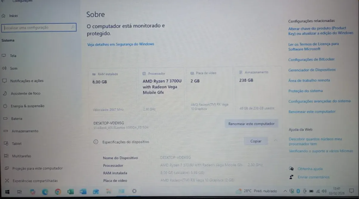 Notebook Asus Processador: AMD Ryzen 7 3700U (USADO COM GARANTIA)